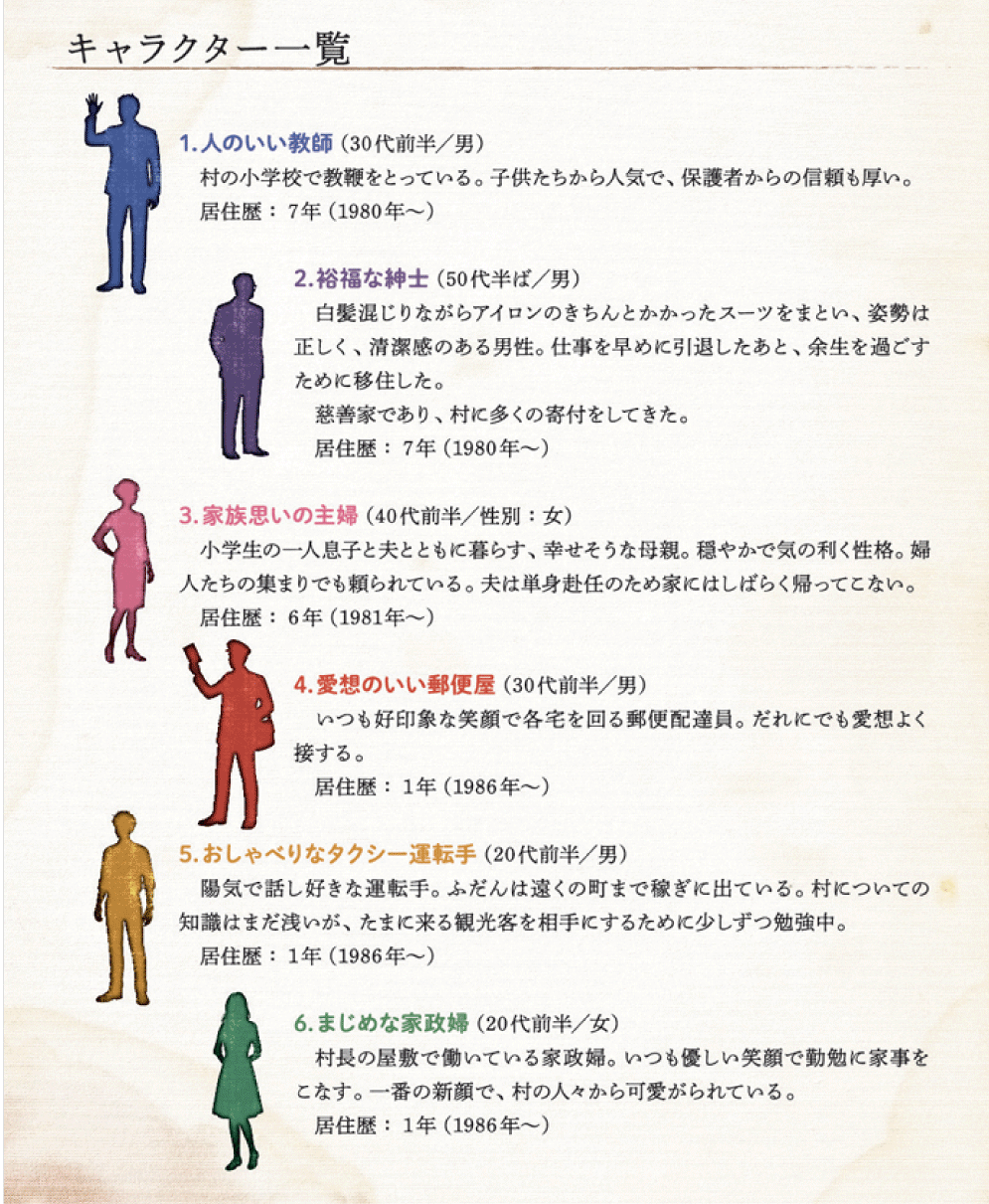 とはいえ唯一の警官が死んだ以上、きっと外敵であろう犯人を捜さなければならない。村人たちから推薦されたのは、警官がもっとも信頼していたとされる6人の善人たちだった――